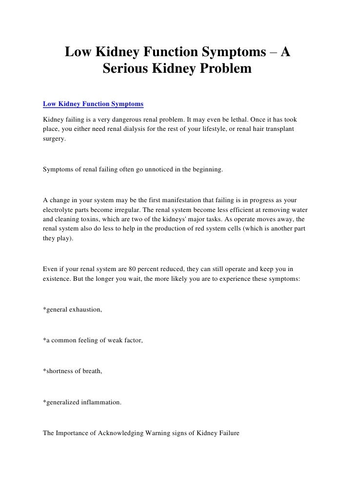 Chronic kidney disease may not become apparent until your kidney function is significantly impaired. Low kidney function also known as chronic kidney disease is treated with medications that control high blood pressure high cholesterol anemia and swelling notes Mayo Clinic. Your doctor may attack your kidney disease from several different directions at.
